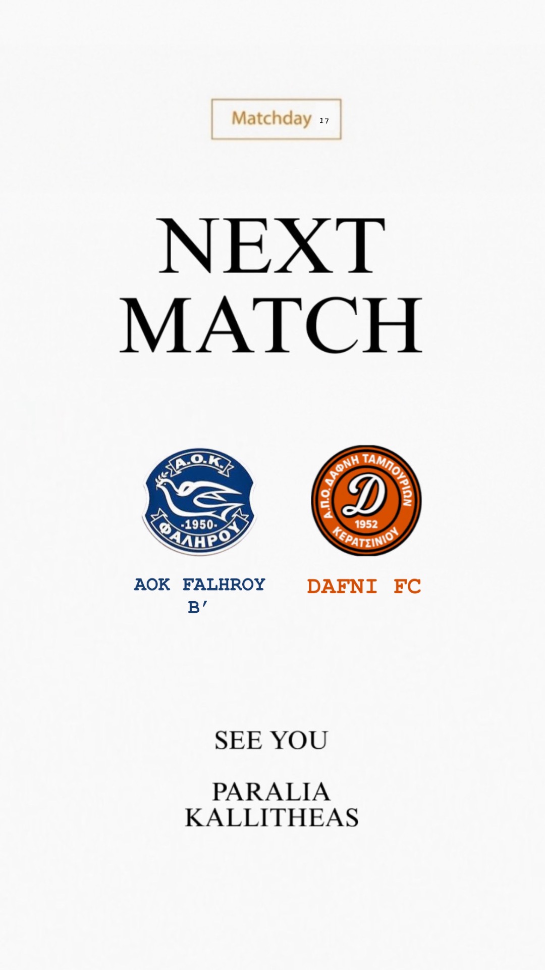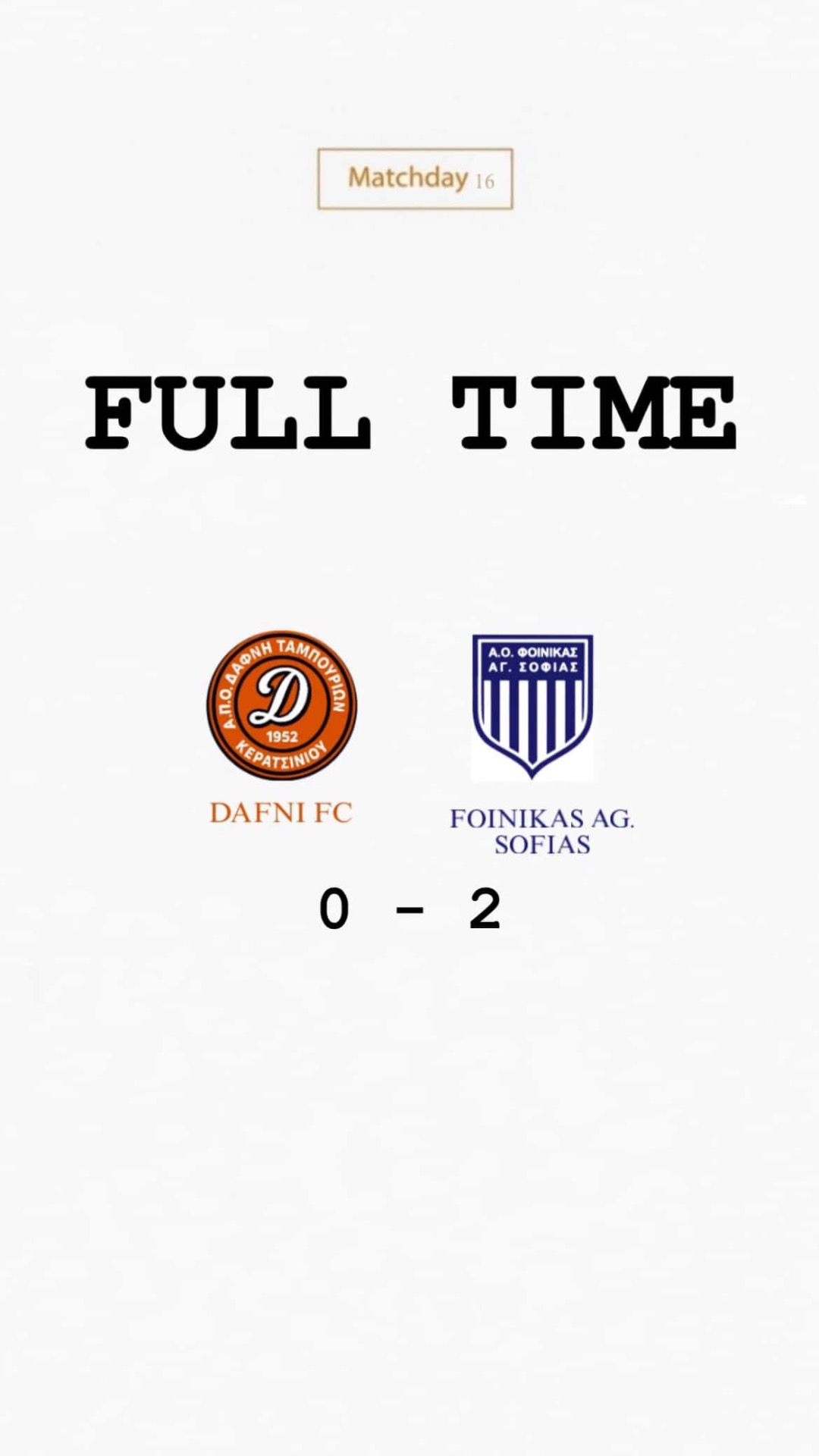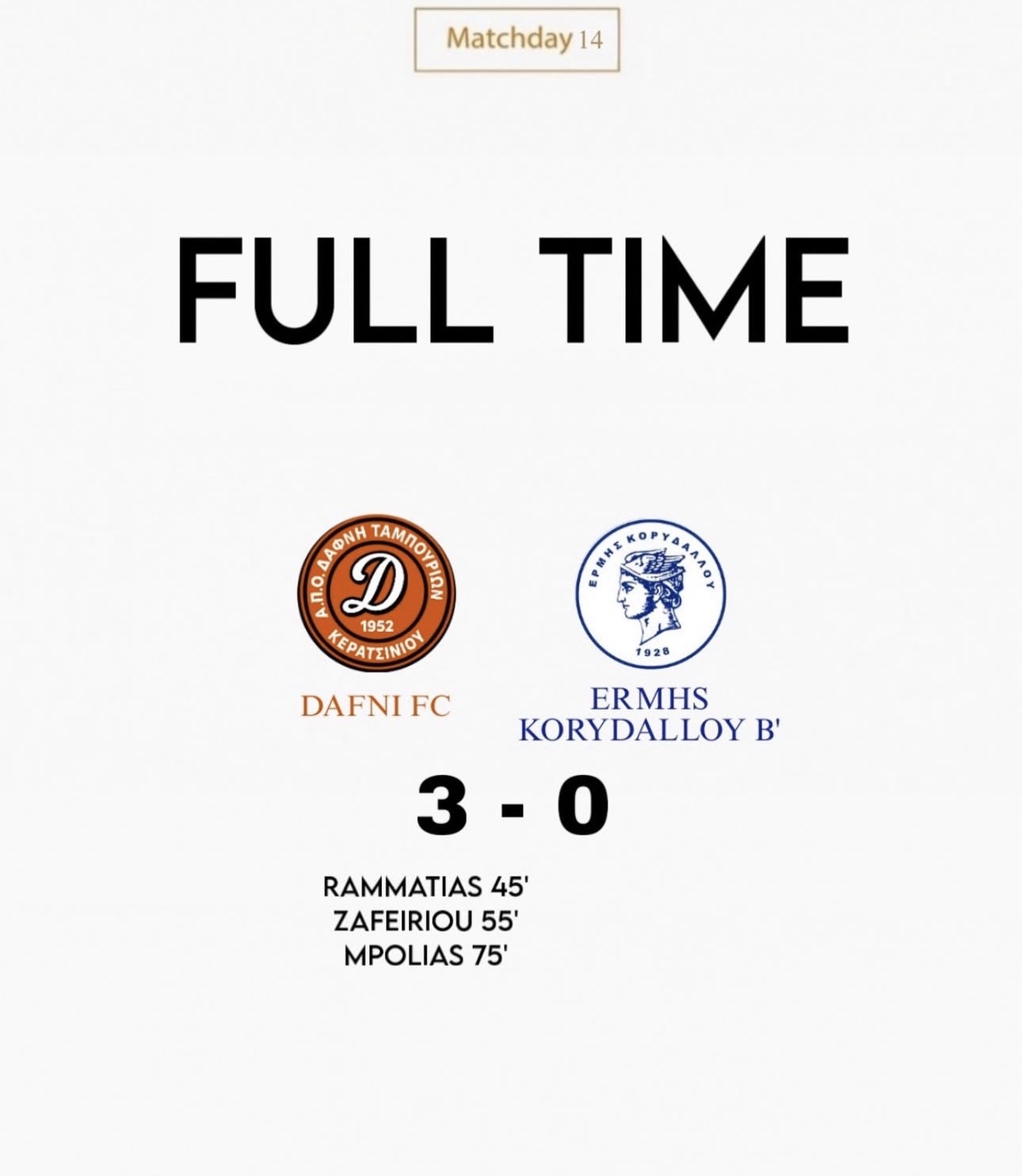 'Η ομάδα μας μπήκε δυνατά στον αγωνιστικό χώρο από το πρώτο λεπτό ομως δέχτηκε αρκετή πίεση απο την αντίπαλη ομαδα,ο ραμματιας ξεκλείδωσε την αντίπαλη άμυνα στο 45 με ωραίο τελείωμα μετά από γύρισμα του μπόλια,την σκυτάλη πήρε ο ζαφειριου που στο Στο ντεμπούτο του με ωραίο σουτ μέσα από την περιοχή έκανε το 2-0,ενώ το κερασάκι Στην τούρτα εβαλε ο...