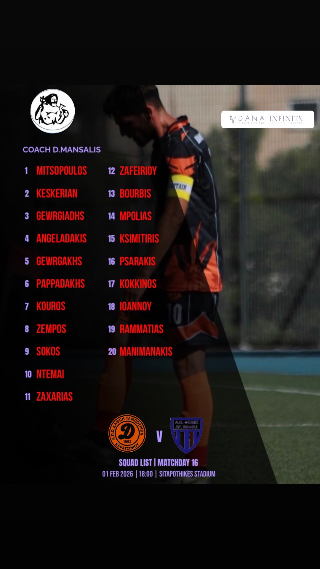 🟠Η αποστολή που επέλεξε ο προπονητής της ομάδας μας Δημήτρης Μανσαλης για τον Κυριακάτικο Ντερμπι με αντίπαλο τον Φοινικα Αγιας Σοφιας για την 16η Αγωνιστική του Πρωταθλήματος .