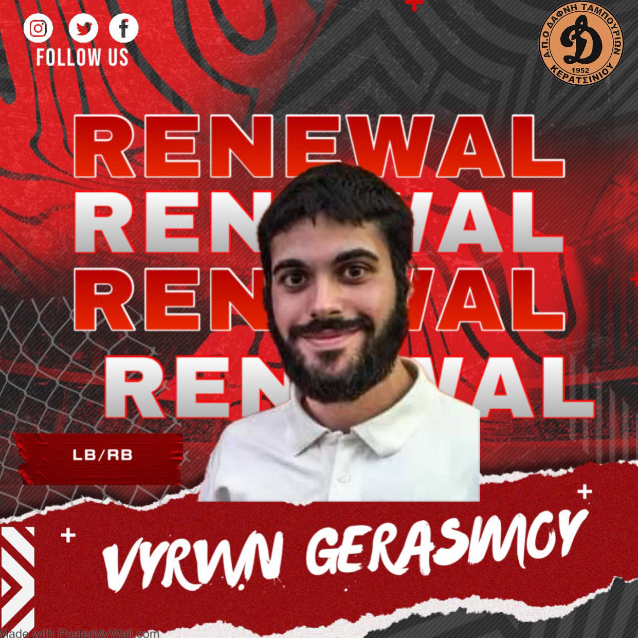 Είμαστε στήν ευχάριστη θέση να ανακοινώσουμε την επέκταση συνεργασίας με τον ποδοσφαιριστή της ομάδας μας Βυρωνα Γεράσσιμου για την χρόνια 2024-2025 Ευχόμαστε υγεία και πολλές επιτυχίες !