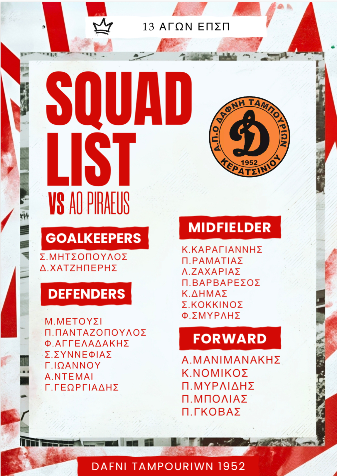 Η ομαδα αντιμετωπιζει σε εντος εδρα παιχνιδι στο πλαισιο της 13ης Αγωνιστικής τον ΑΟ ΠΕΙΡΑΙΑ την Κυριακη 02 Φεβρουαριου .