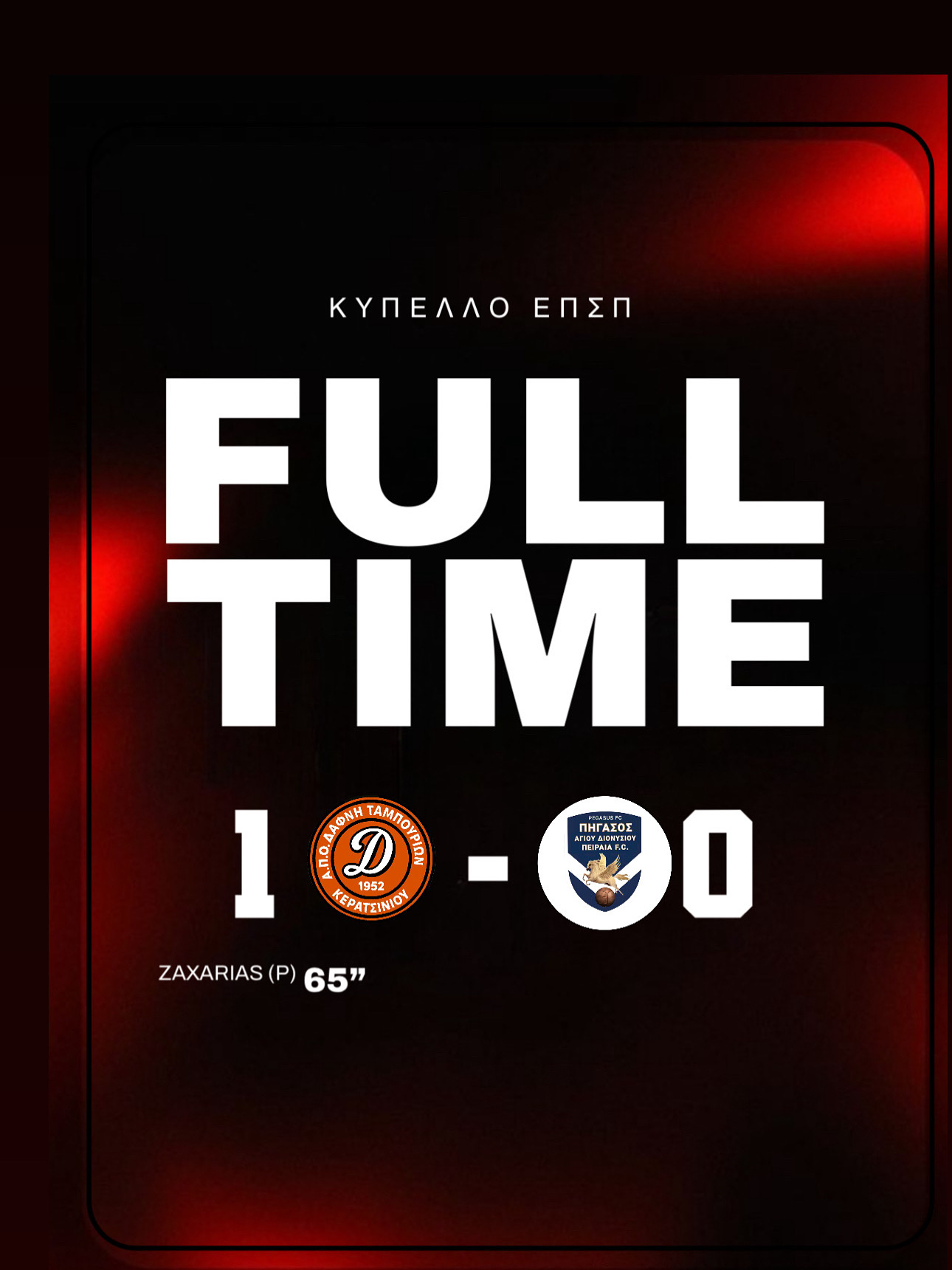 Με εμφάνιση γεμάτη πάθος, δύναμη και αποφασιστικότητα, η ομάδα κατέκτησε σπουδαία νίκη απέναντι στον Πήγασο Άγιου Διονυσιου με σκορ 1-0 εξασφαλίζοντας την πρόκριση στην επόμενη φάση του Κυπέλλου ΕΠΣΠ.